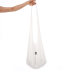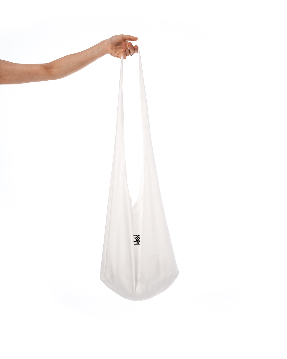 Ręcznie robiona torba wykonana z białej 100% wiskozy, inspirowana bindle bag, z monogramem rebrandt nadrukowanym na środku przodu.