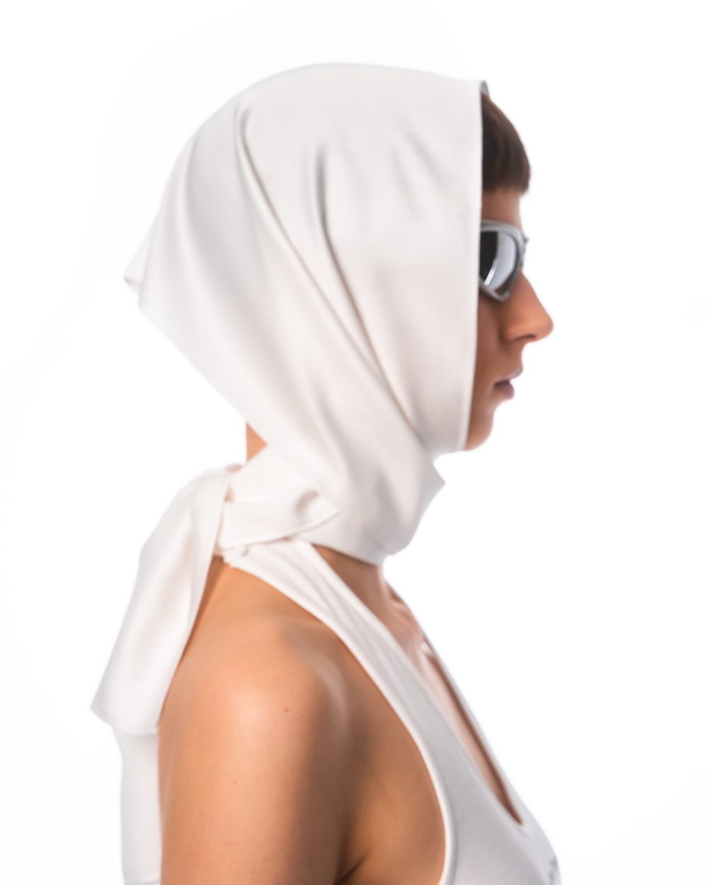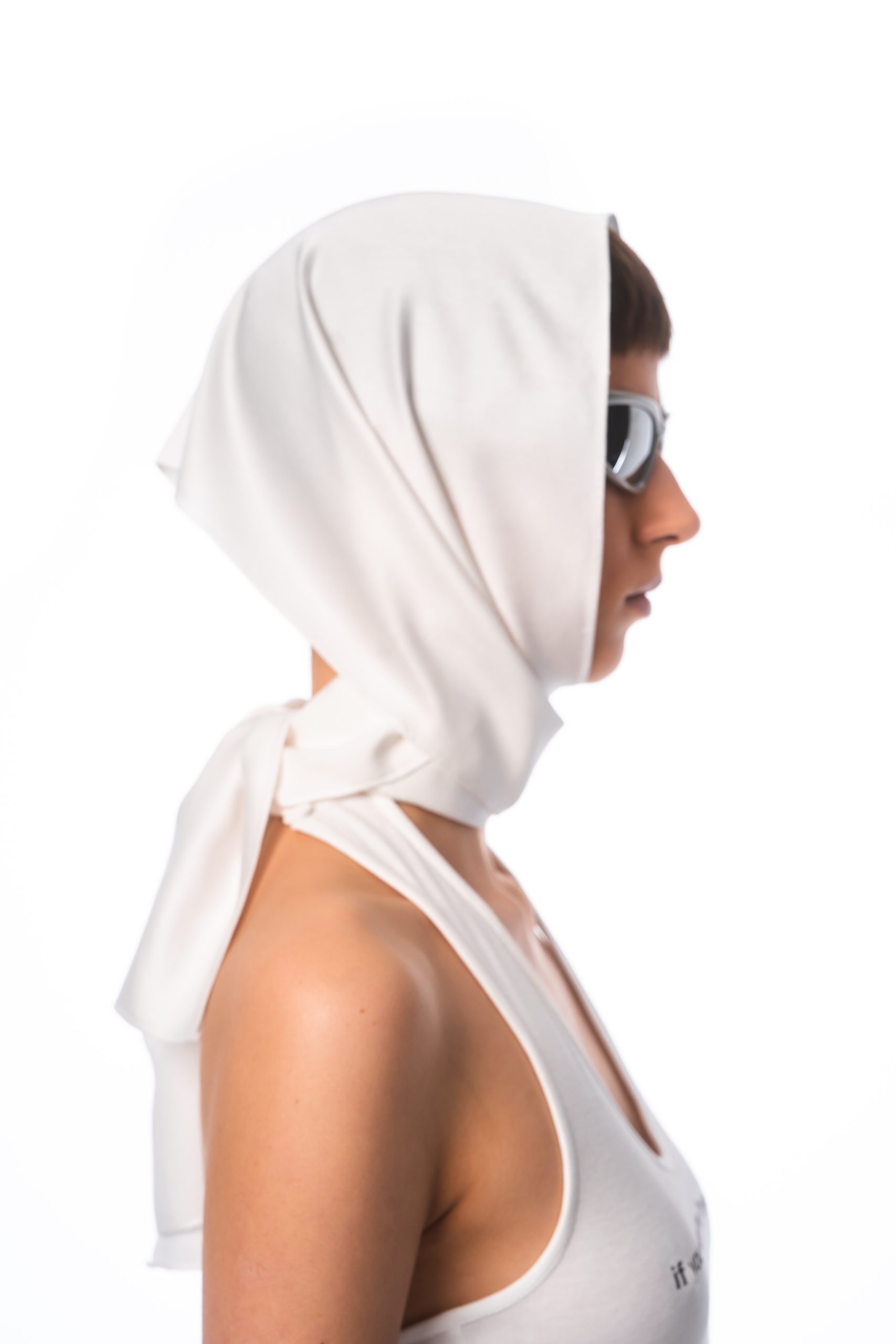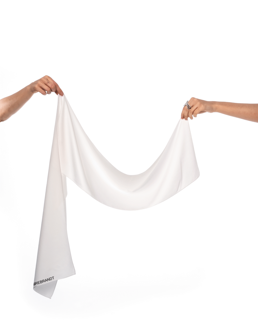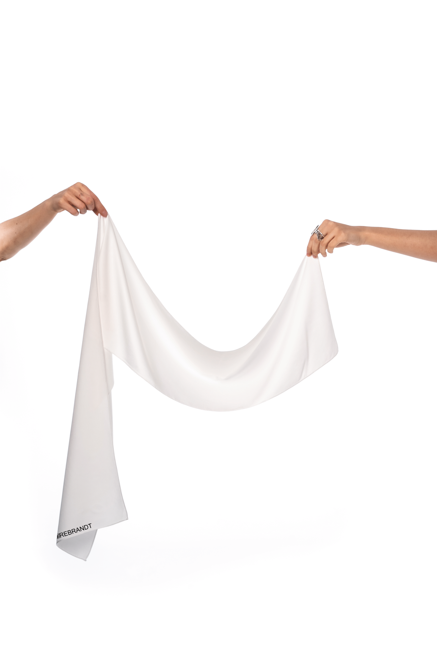 Ręcznie robiony szal wykonany z białej 100% wiskozy o wymiarach 155×30 cm, z nadrukowanym logo rebrandt przy krótszym boku.