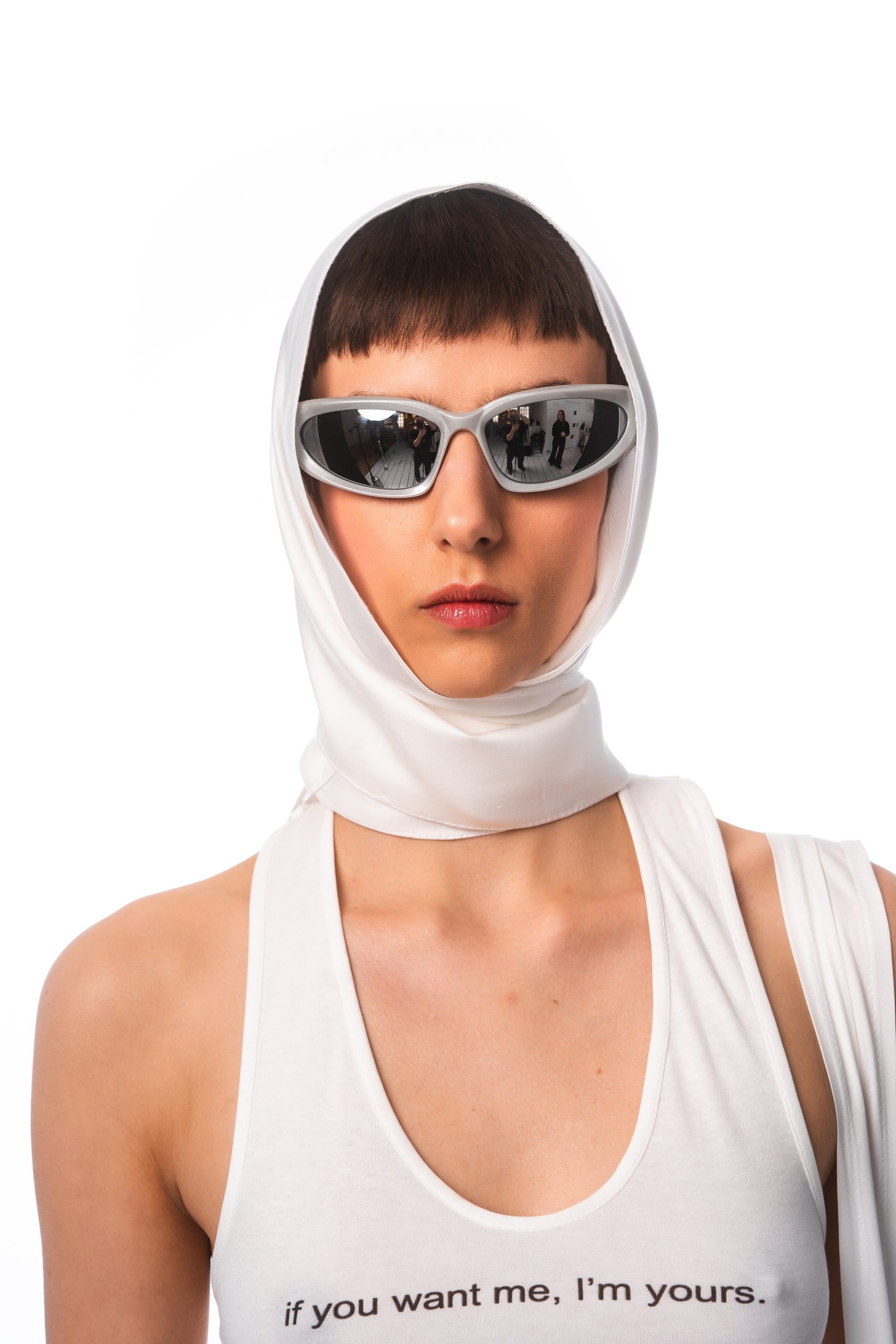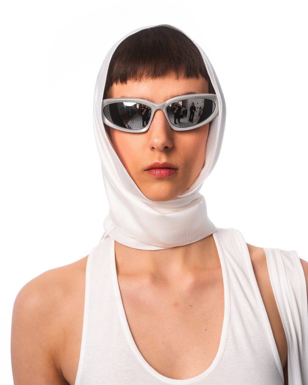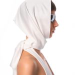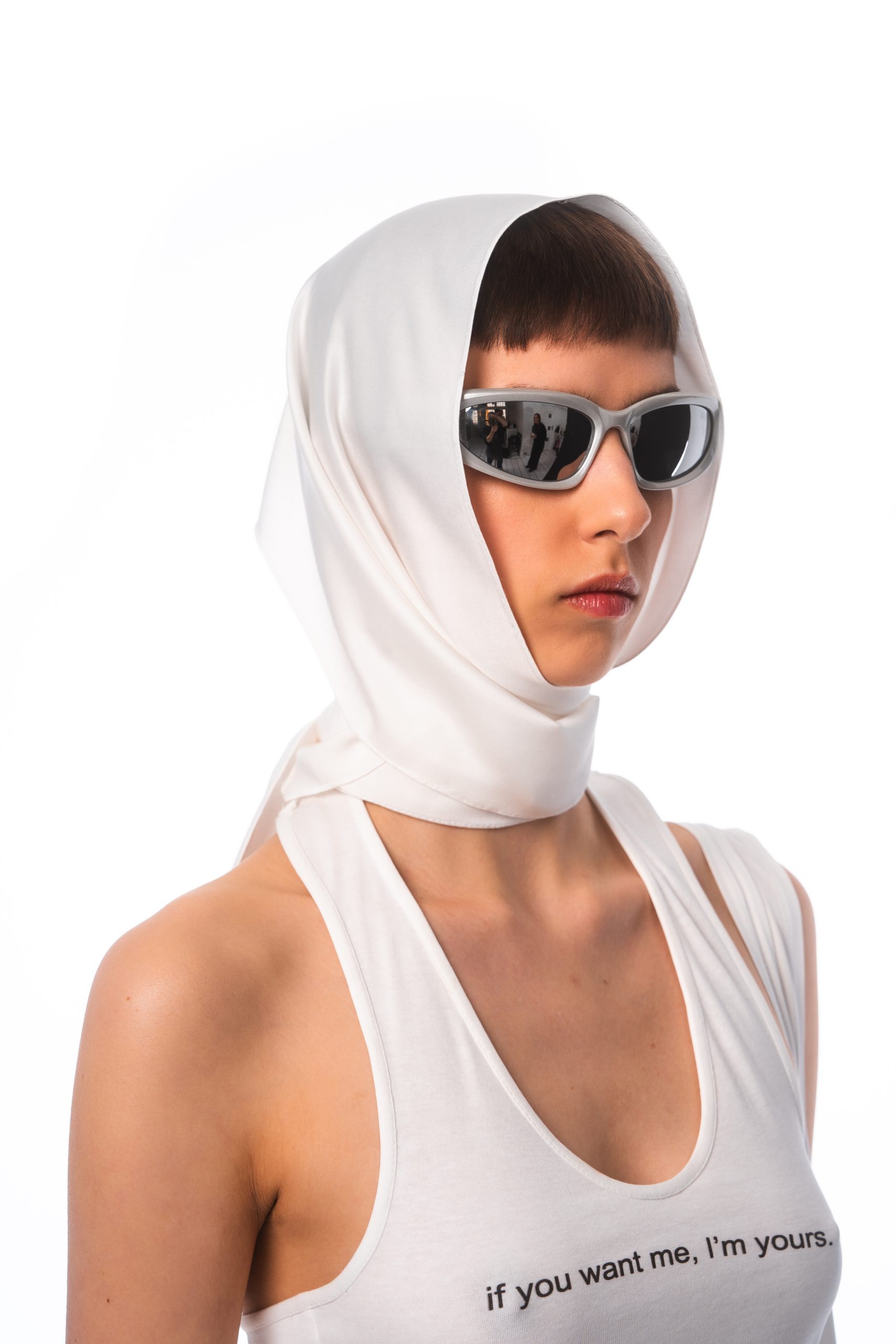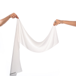 Ręcznie robiony szal wykonany z białej 100% wiskozy o wymiarach 155×30 cm, z nadrukowanym logo rebrandt przy krótszym boku.