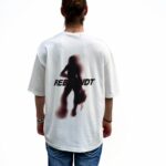 T-shirt w kroju regular fit, wykonany z białej, certyfikowanej 100% bawełny z nadrukiem DTG rozmazanej sylwetki i napisu rebrandt.