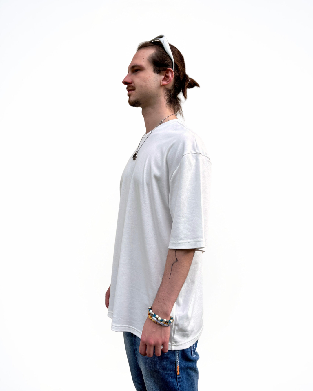 T-shirt ma przedłużony bark, co nadaje mu oversize’owy wygląd.