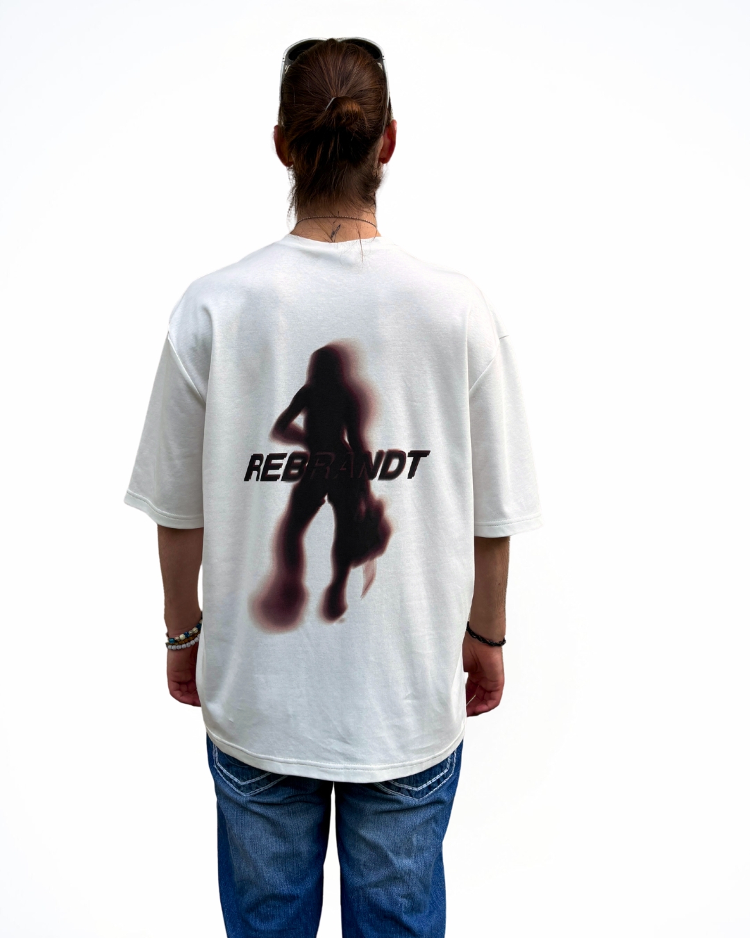 T-shirt w kroju regular fit, wykonany z białej, certyfikowanej 100% bawełny z nadrukiem DTG rozmazanej sylwetki i napisu rebrandt.