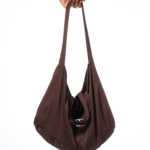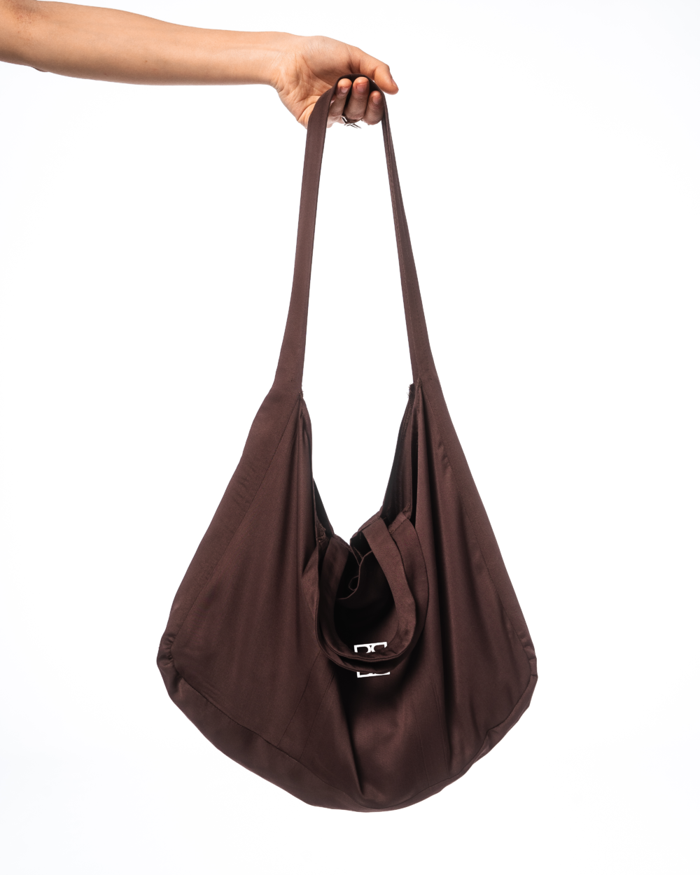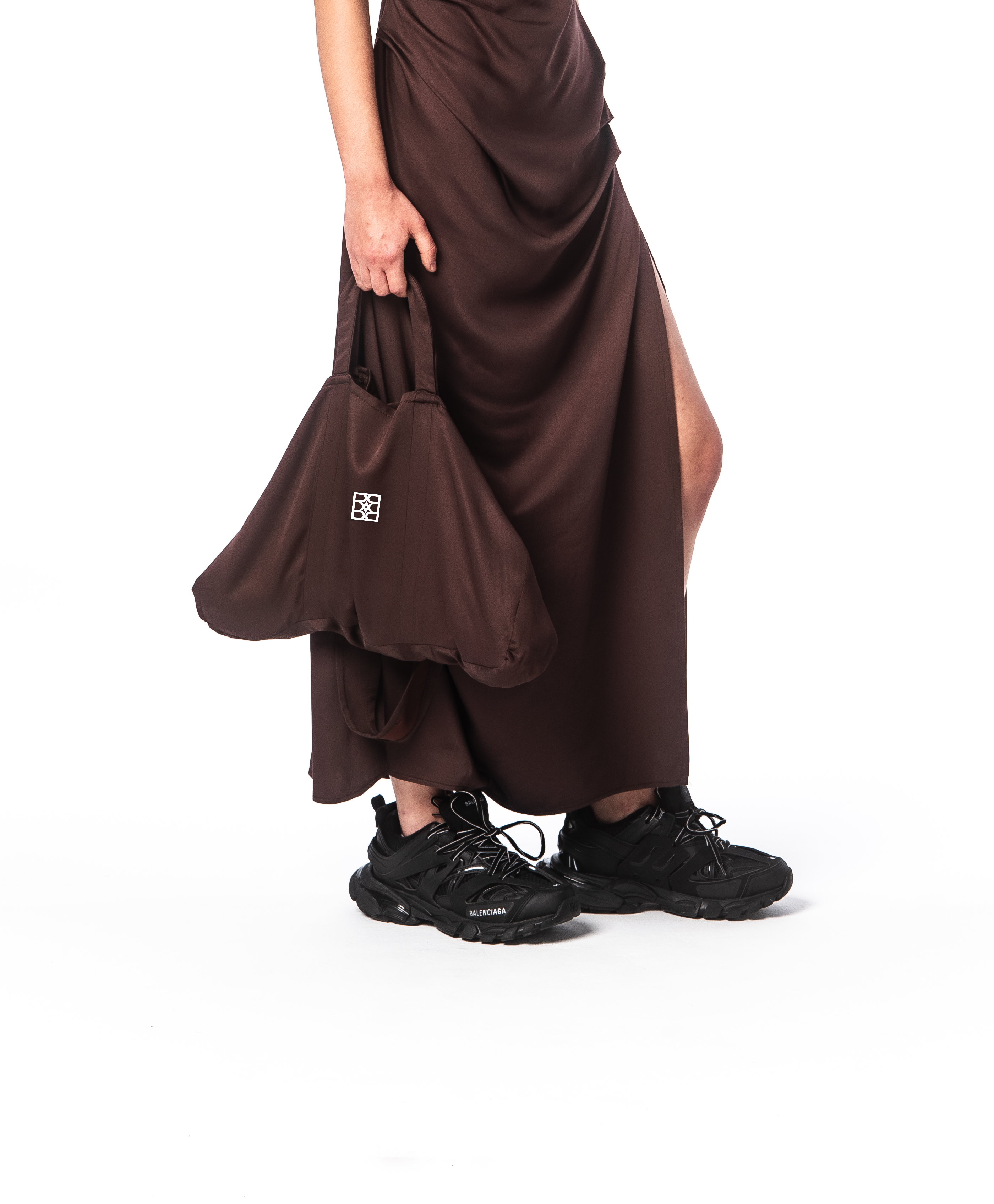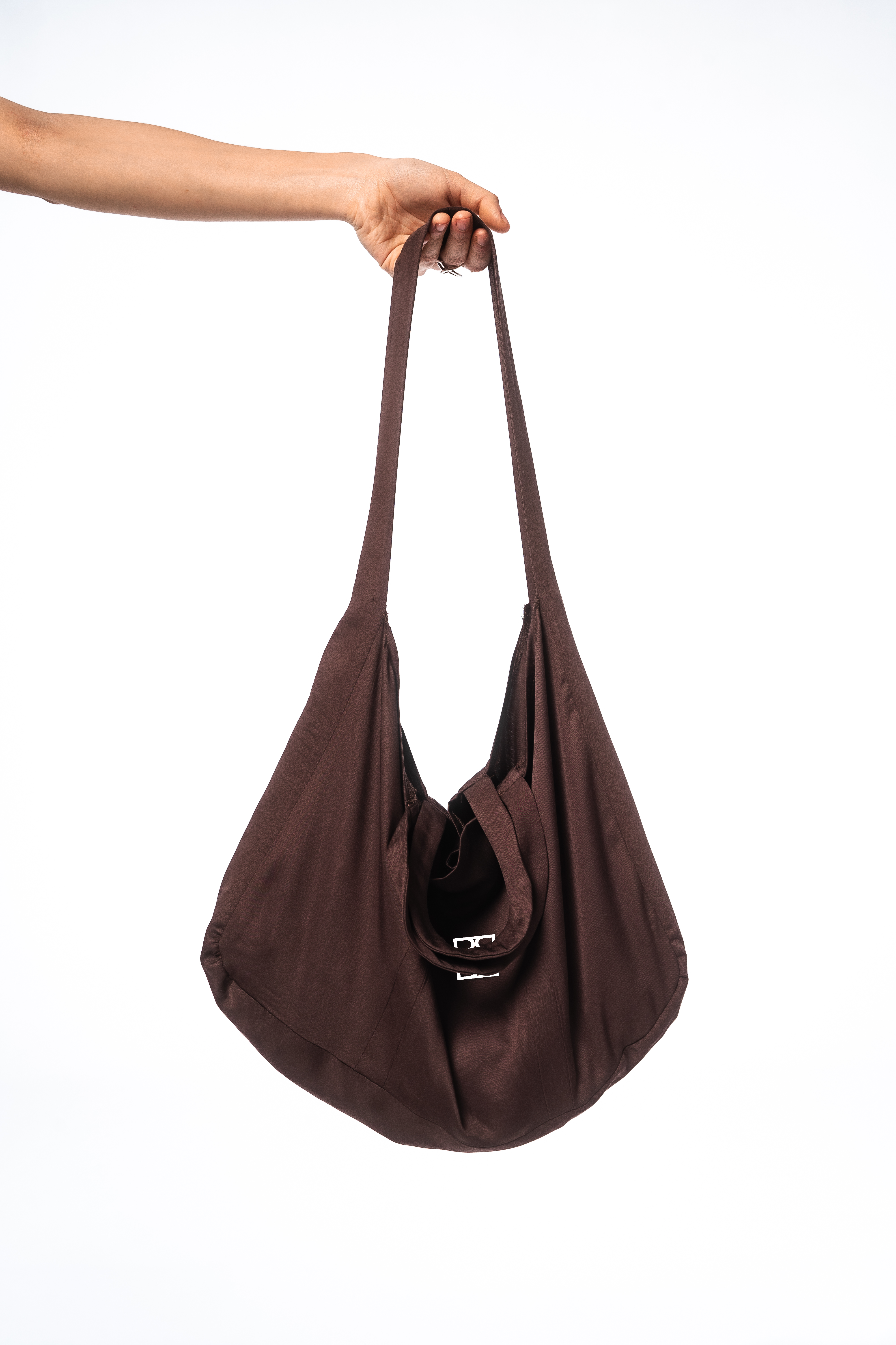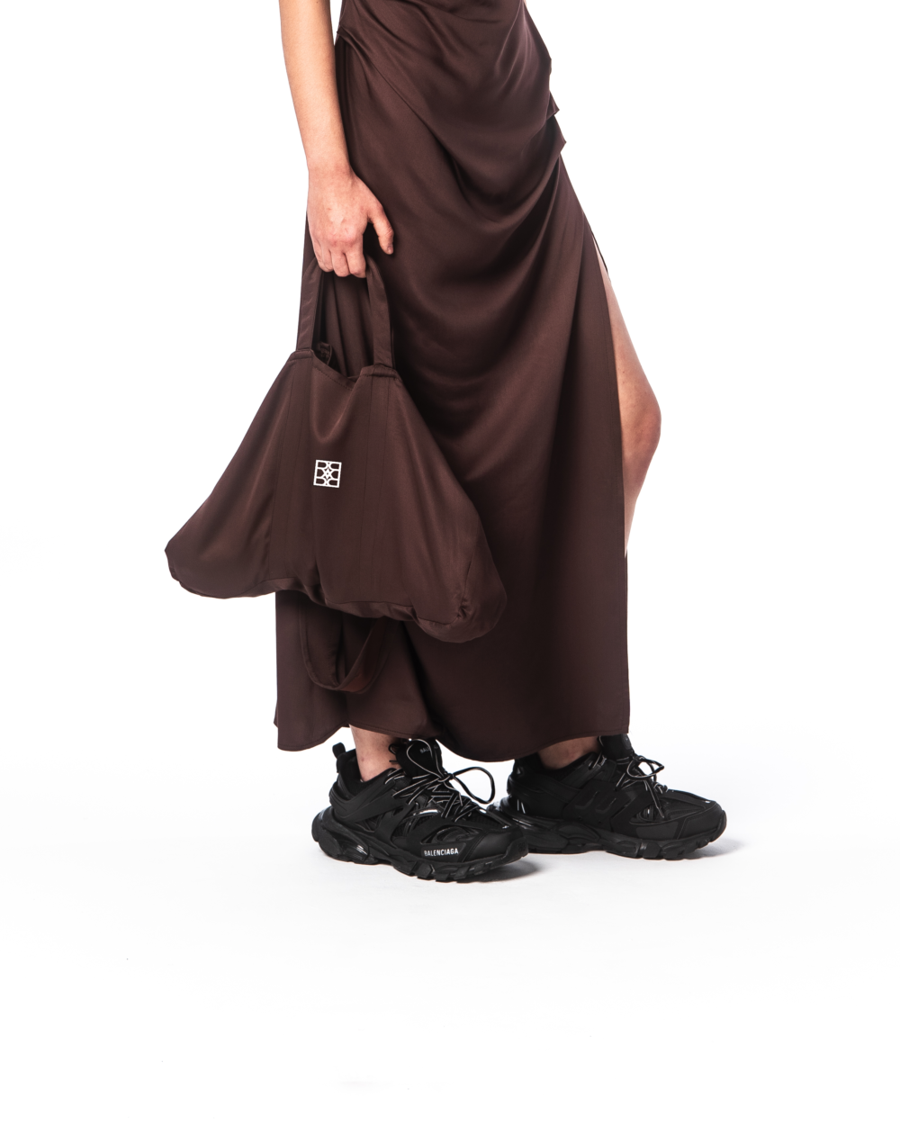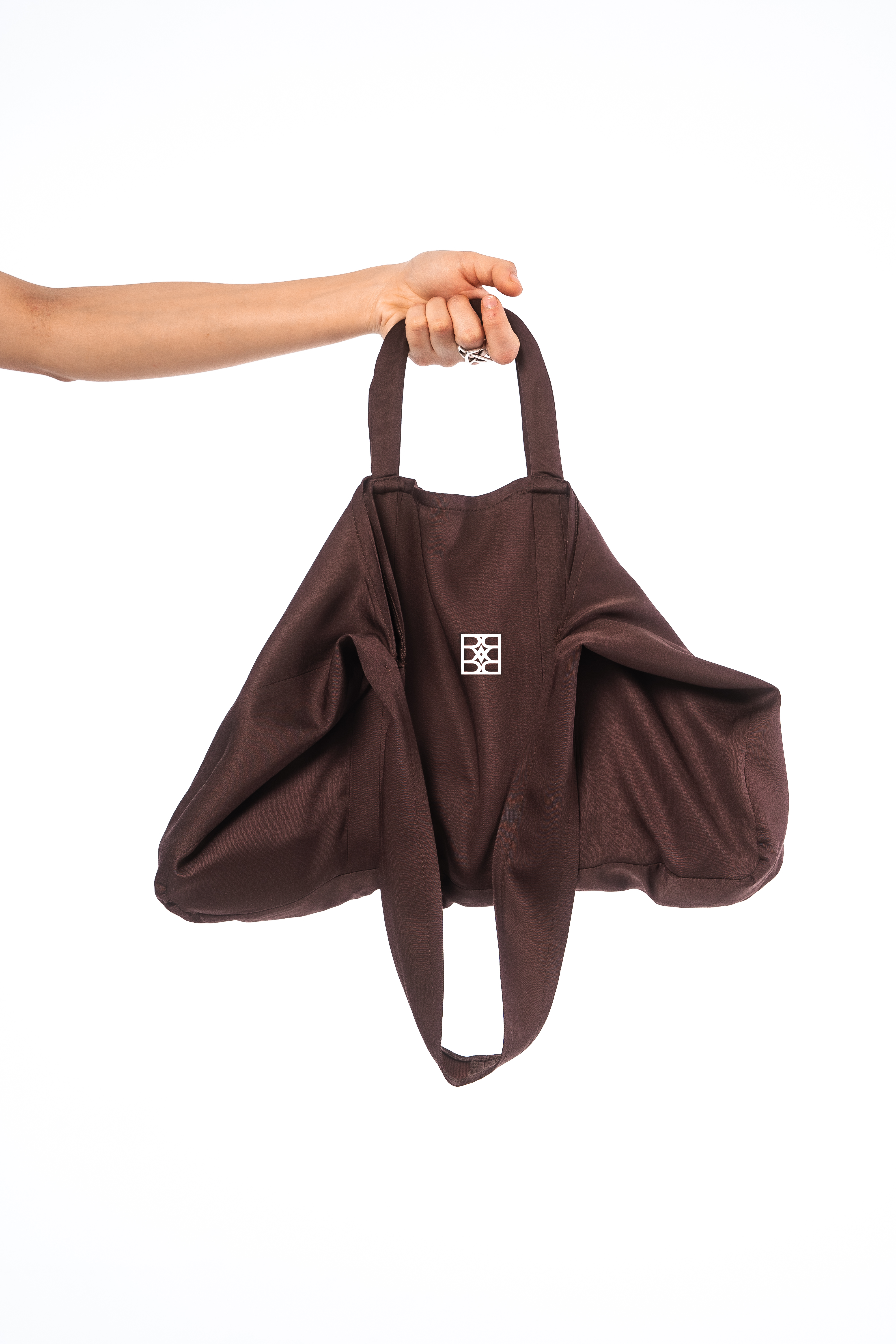 Ręcznie robiona torba wykonana z brązowej 100% wiskozy, inspirowana duffle bag, z monogramem rebrandt nadrukowanym na środku przodu.