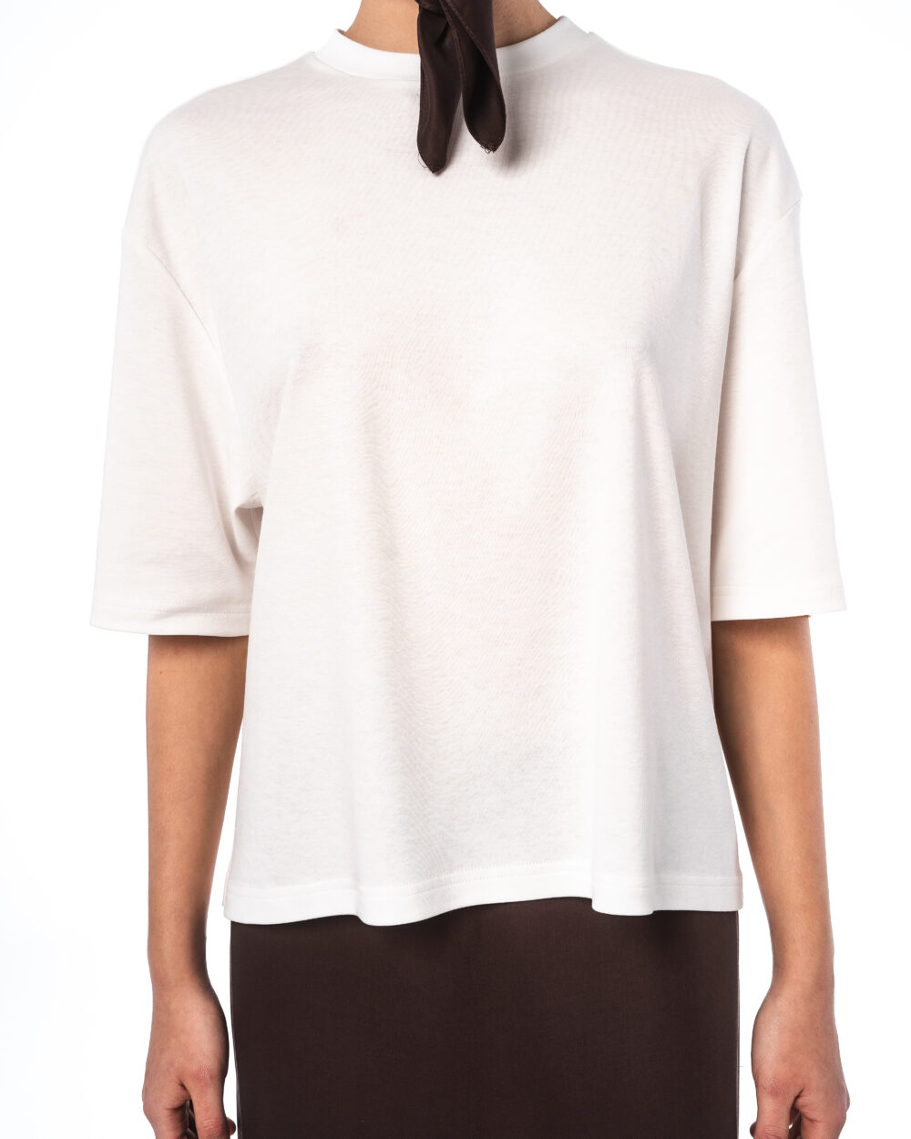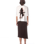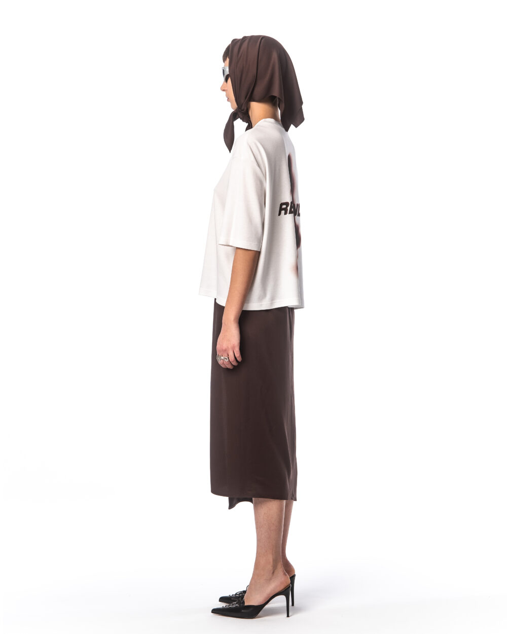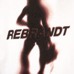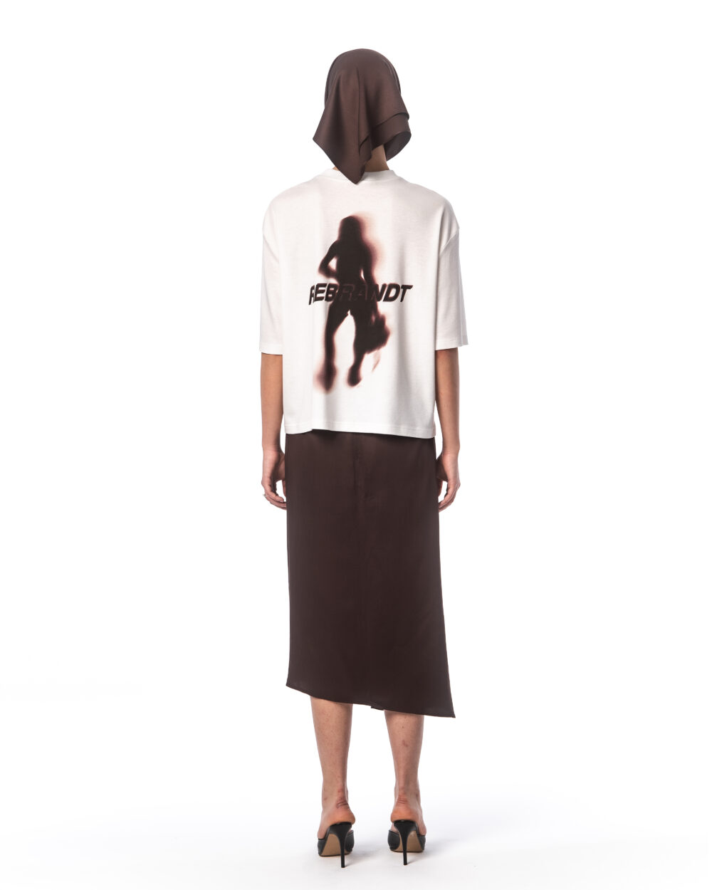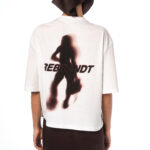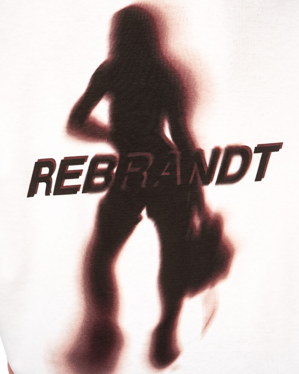 A boxy-fit T-shirt made from white, certified 100% cotton with a DTG print of a blurred silhouette and the word “rebrandt”.