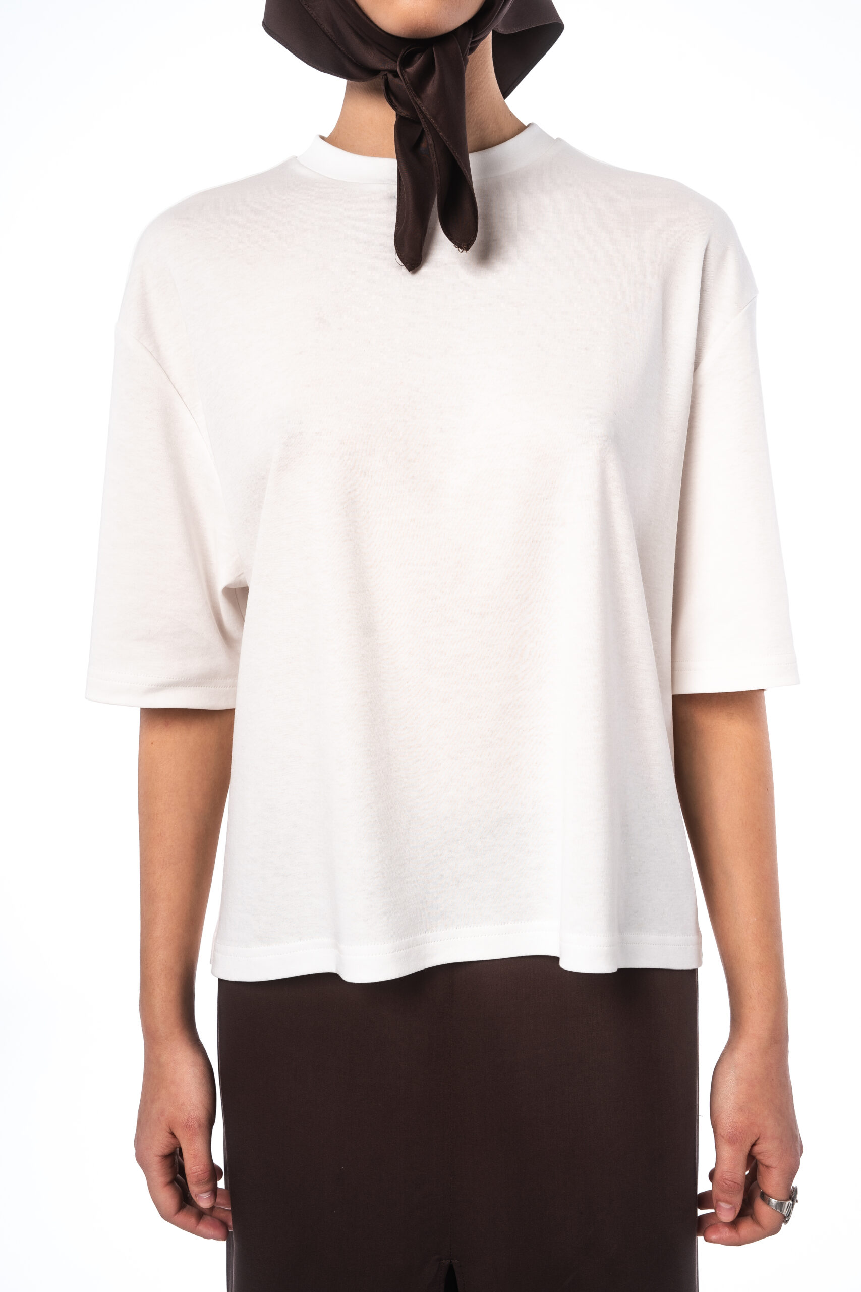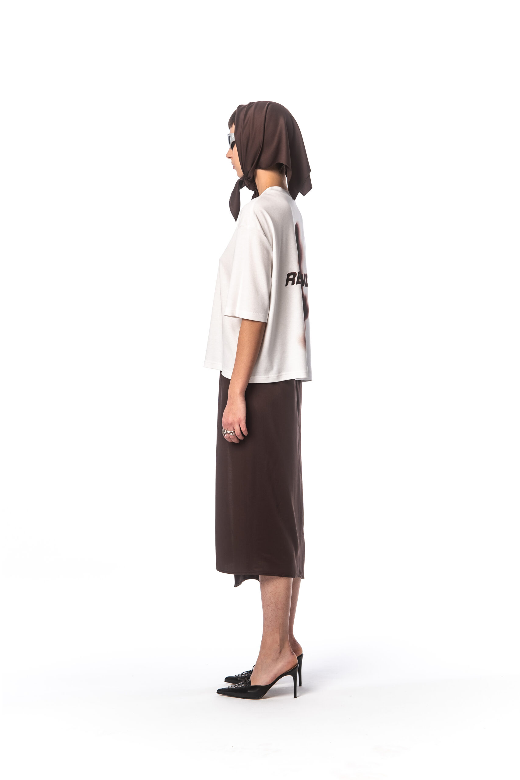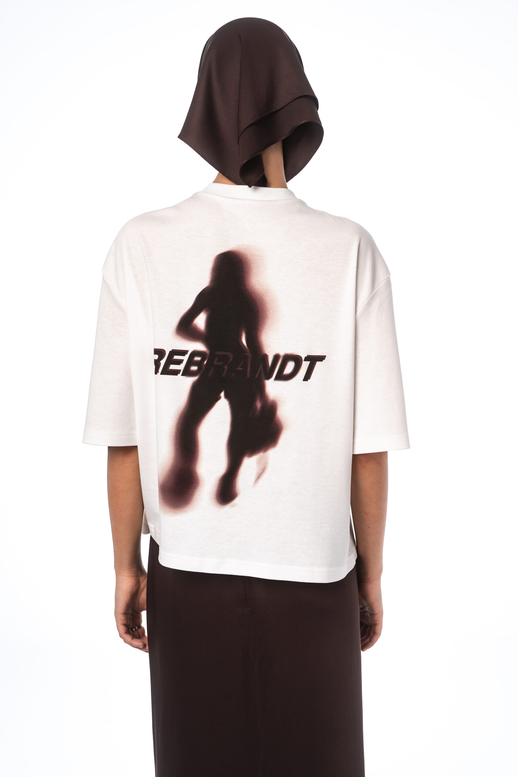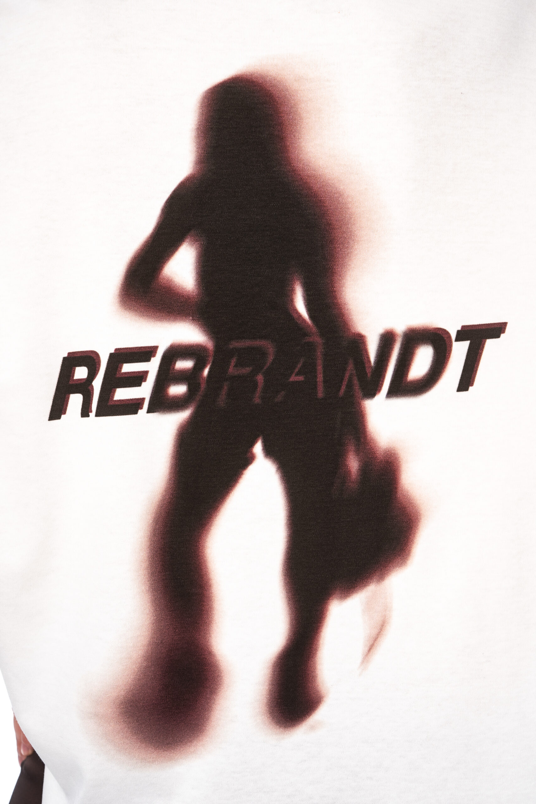 A boxy-fit T-shirt made from white, certified 100% cotton with a DTG print of a blurred silhouette and the word “rebrandt”.